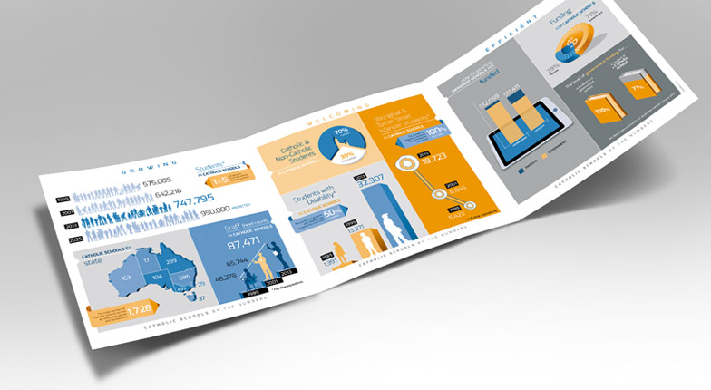 An assortment of collateral documents to showcase the funding and student ratio status of Catholic schools in Australia.