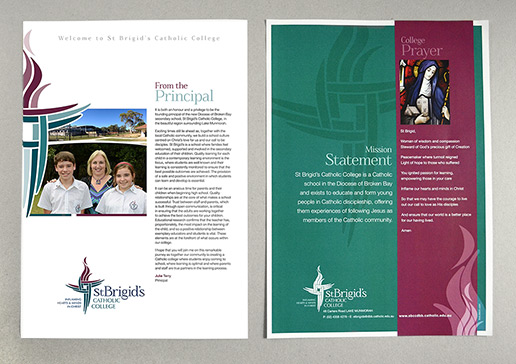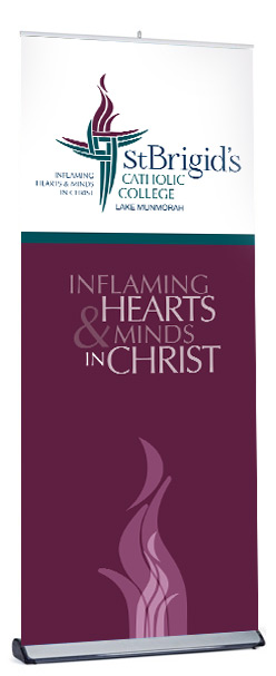 I was invited from the very inception of an academic idea, even before the building was constructed to develop the brand image for all material including the uniforms. The logo creation was a motivation from the Cross that St Brigid used to weave. I created a graphic version of the cross and amalgamated it with a flame to translate the motto of the college. I believe I have stayed true to the brief of creating a modern logo unlike the usual crest/emblem look.